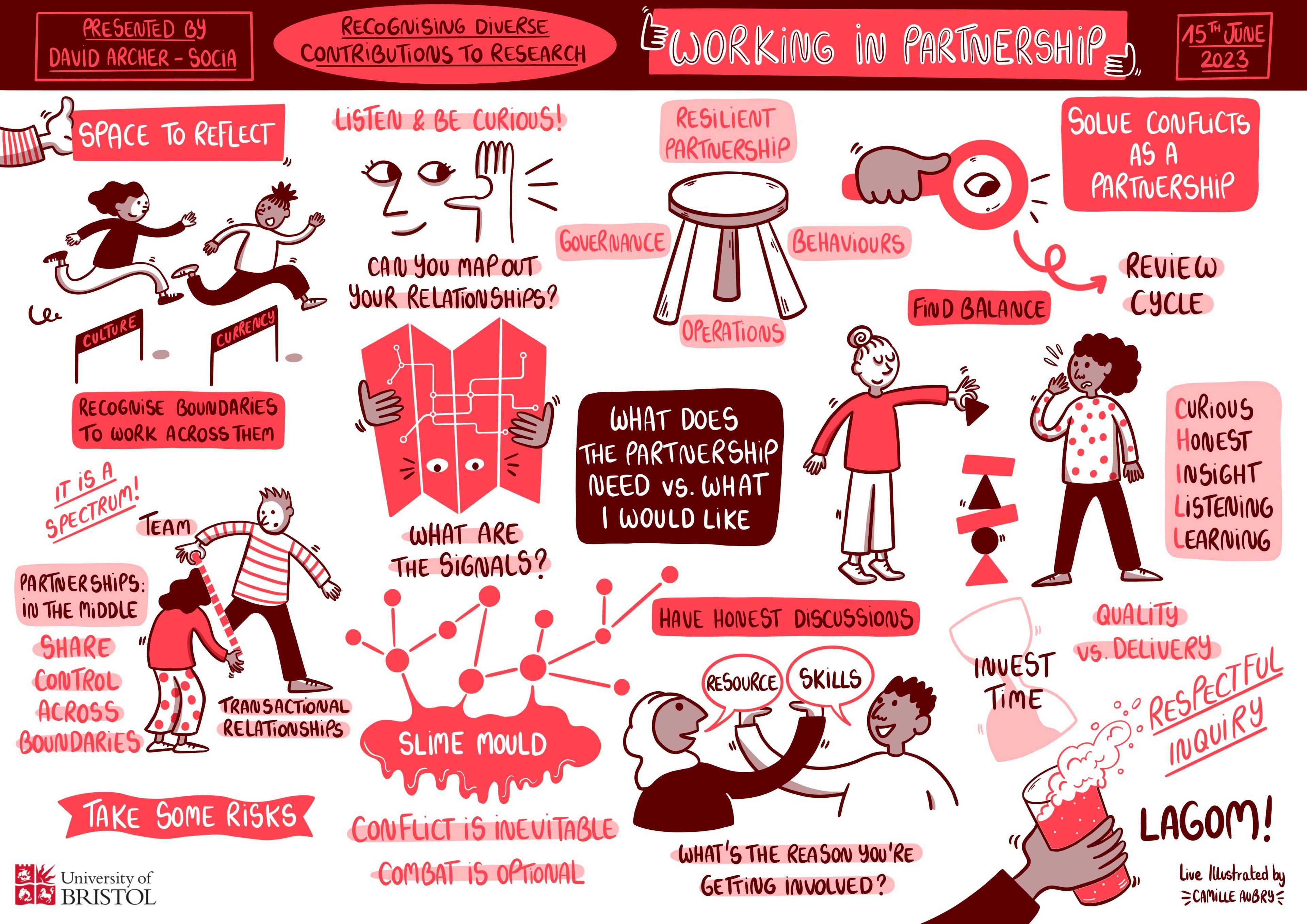Bristol University produced this great visualisation diagram based on a series of workshops Socia delivered on collaboration and partnership working to staff attending the University’s Enhancing Research Culture programme