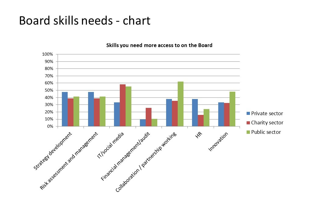• HR skills are a particular need for these Boards compared to the other two sectors (38% compared to 16% charity, 24% public sector) |