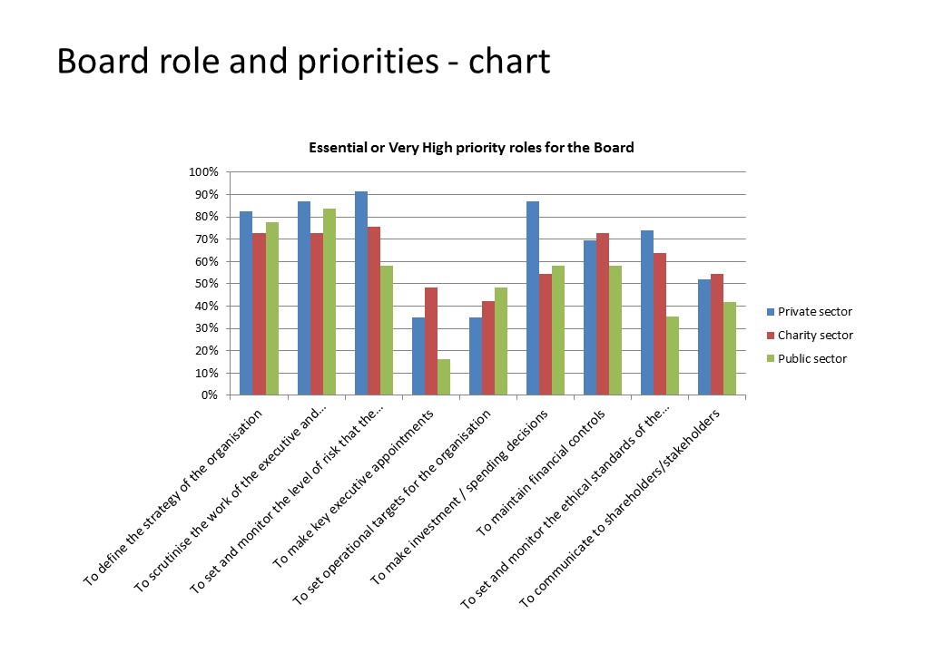 | Priorities: Public sector out of step with other Boards Risk management: • Private/plc 91% high priority • Charity/mutual 76% • Public sector 58% • Private/plc 74% high priority • Charity/mutual 64% • Public sector 35% |