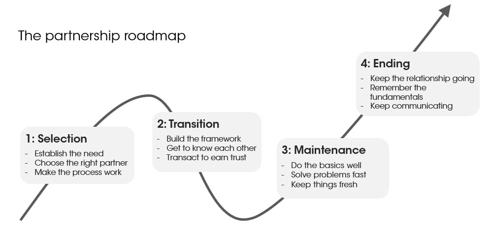 Any business relationship will go through different stages, each with their own ups and downs. Based on our experience of working with diverse organisational groups that need to collaborate more effectively we have developed a partnership roadmap which helps diagnose the symptoms you may see as you move from stage to stage – and how best to react to them.